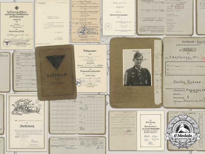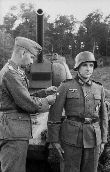 这位二战德国士兵,名做Günther Viezenz,他领口处戴的是骑士勋章,下面的纽扣上有一个二级铁十字缎带,左胸口上挂着一枚一级铁十字勋章,右胸口是德意志金质章。右臂上的坦克幅,代表他以步兵身份击毁过坦克,不同的颜色代表他击毁过不同的坦克数量,金色表示使用单兵武器击毁过5辆坦克,银色表示击毁了1辆坦克。上面那张照片并不是他的最终战果。