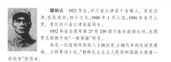 志愿军27军80师239团7连4班班谭炳云在战友的配合下,连续击毁敌人3辆坦克和1辆汽车,将公路堵塞,将北犯之敌阻滞于我阵地前不能前进达8小时之久,为我部署防御和转移人员物资争取了宝贵时间。