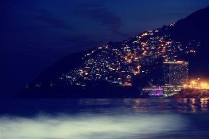 近处的高楼与远处维迪加尔贫民窟的灯火