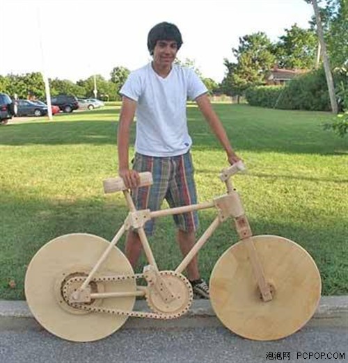 全部零件都是木质的自行车 这是一款由加拿大的一名16岁高中生制作的全木质自行车,这款自行车的独特之处在于,不仅仅是框架和车轮,连齿轮和链条以及整个自行车的所有零件完全由木头制成。而更为神奇的还在于,这款自行车竟然是可以骑的!
