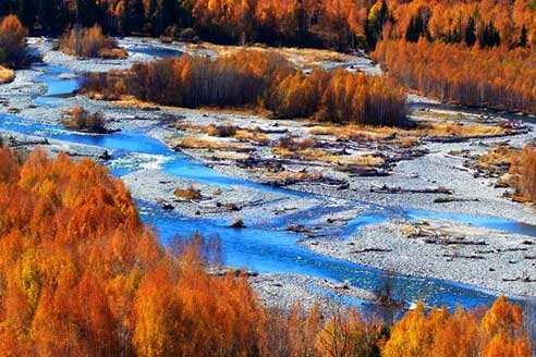 新疆哈巴河 2.高原密林的故事:新疆哈巴河 哈巴河位于新疆阿勒泰地区的西部,额尔齐斯河北岸,是孕育着童话故事的一个小县城。阿勒泰在蒙古语中是金山的意思,此地森林茂密、雨雪充沛,是边疆荒漠中的绿色天堂。巨大的冰川和融雪蜿蜒成最美的河流哈纳斯,在金光闪烁、连绵起伏的阿勒泰脚下静静地流淌。整个阿勒泰山区垂直分布着从温带落叶林到极地苔藓各种植物,生活在这里的牧民可以从每一种景观的色调变化中看到时间,从而确定转场游牧的时间。哈纳斯河最美的河段叫月亮湾。从山颠往下看,形如弯月的河湾将两岸金色的白桦林分割成许多片断。绝妙之处在于水色,晴天深绿,阴天灰白。 交通贴士: 到哈巴河的交通工具以汽车为主。从乌鲁木齐出发,可以有两条路线绕过准噶尔盆地到此:一条经吉木萨尔、齐台往北,顺黄金通道直达阿勒泰市,再往西奔布尔津县城,再往北可至哈巴河县城。另一条经石河子市、奎屯、往北过克拉玛依,可至布尔津县城,再到哈巴河县城。