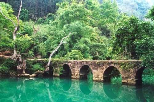 小七孔指的是一座七孔桥,它在古代是惑州和广西的交界处。走过小七孔桥,你便脚踏两省了。小七孔的景点都是沿山路分布的,最好的游览方法便是坐着当地农民赶着的驴车漫步其中。一路上,一侧是山,一侧是水,时而能看到参天的大树倒栽葱地倒在水里。树的根部已经枯死,而泡在水中的枝干却有的发芽并长出了绿色的枝叶,横漂在水中。尤其美的是这里的水,虽然是一条长长的河,间隔不久便会有很大的落差,看上去是由一个接一个的小瀑布组成。有时落差间隔很小,一层层的瀑布便连成了一片,白花花的水帘从绿色的石头上流过,流入清澈见底的河流当中,其间还有许多水灵灵的水草。且不说如此的美景,就是这一路上的水声也足以让人心旷神怡了。