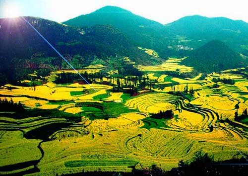 浩荡珠江的源头,磅礴乌蒙的南麓,滇、桂、黔三省(区)结合部,有一块曾令明代大旅行家徐霞客为之亢奋并驻足停留连数十天之久的神奇而美丽的土地──罗平。20万亩菜花把罗平的山川大地装点得一片金黄,罗平坝子里十五万亩连片油菜形成了世界最大的花园,辽阔无边。在花海中央突起的笋柱状小山,是喀斯特岩溶的一种典型地貌,这种另类的田园风光,也是罗平一个引人注目的焦点。步入花的海洋,成群结队的蜜蜂飞满头顶的天空和周围的世界,它们是那些追蜂逐蜜的养蜂人从全国各地带来的。养蜂者,这些中国唯一流浪春天的吉卜赛人,安营扎寨油菜花中,风餐露宿,为金色的花海添置了另一道风景。