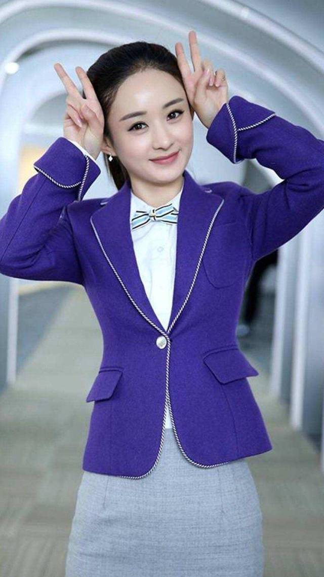 赵丽颖这套是《加油吧实习生》里面的OL装,却有着空姐服的设计风格,灰色的包臀裙,脖子上还系着蓝白色的蝴蝶结,职业风的制服也丝毫隐藏不了她甜美的小脸蛋。