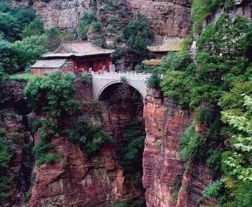 苍岩山 苍岩山:你当初看《卧虎藏龙》的时候,肯定跟我一样,以为玉蛟龙纵身跳下的那个悬崖间飘逸的石桥在武当山。瞧,我们就是容易被导演的糊弄。那座桥根本不在武当山,而是在河北石家庄附近的苍岩山。