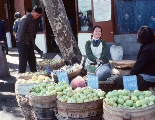 国营副食商店卖的苹果每市斤4毛多,营业员显得很悠闲。