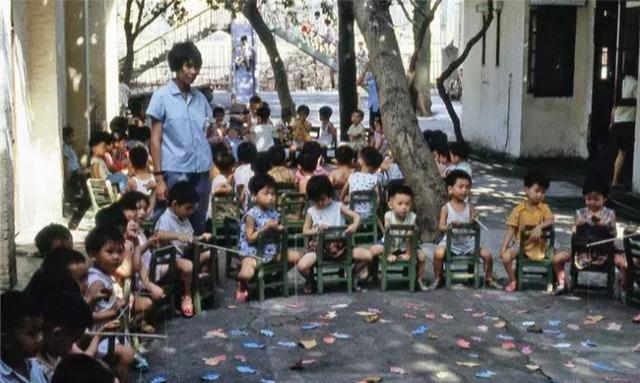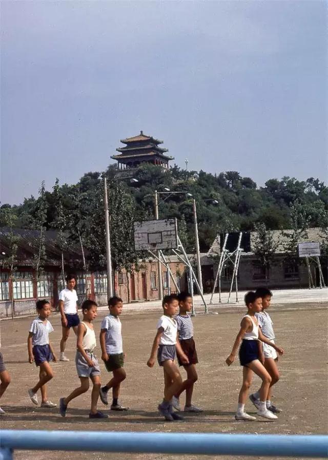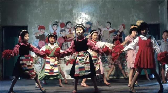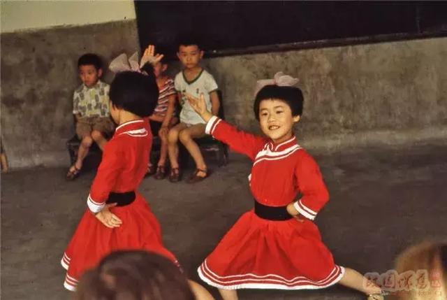 那时候小学生穿戴男孩子有崇尚军人童装,女孩子衣着开始有了色彩。