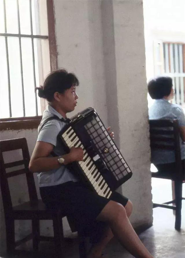 音乐老师在拉手风琴。