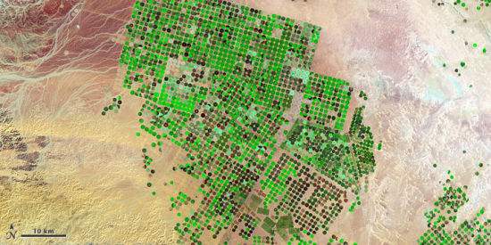 卫星鸟瞰照,沙特阿拉伯沙漠农业区。