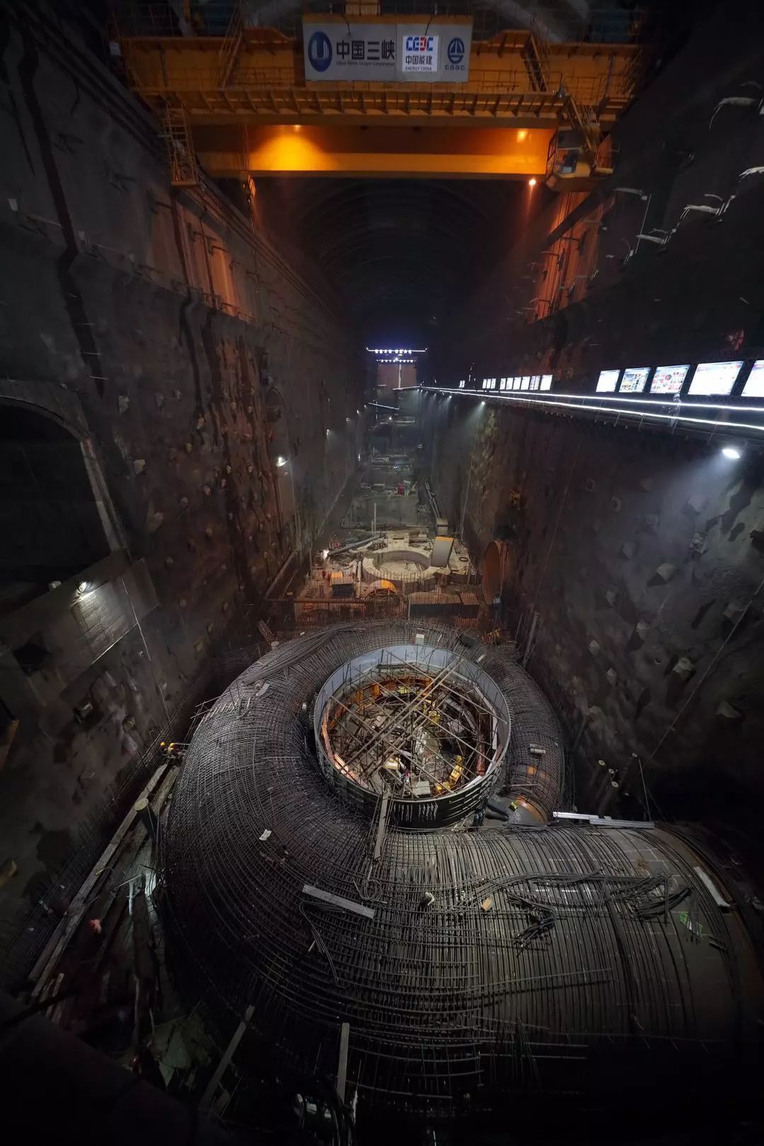 ▼白鹤滩水电站正在修建的水轮机室(也称“蜗壳”),用于将水流沿圆周方向导向轮机