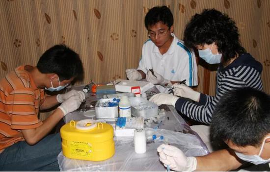 然后我们把蝙蝠从网上取下,连夜采集拭子样品。如果收获的蝙蝠多的话经常会工作到凌晨一两点,取了样就要把它放掉。