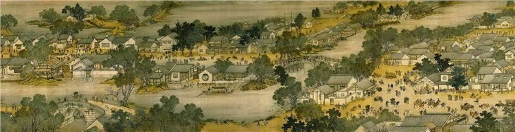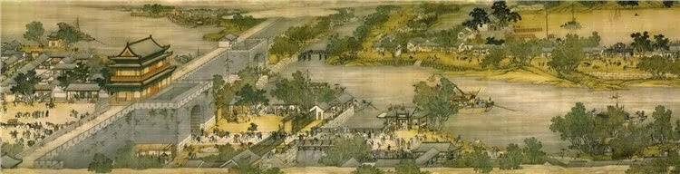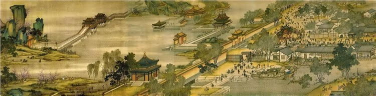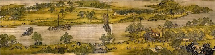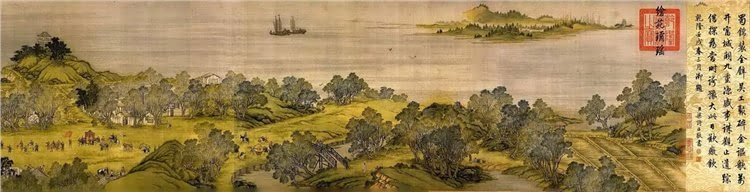 六、北宋.王希孟《千里江山图》 《千里江山图》,北京故宫博物院馆藏珍品。绢本,设色,纵51.5厘米,横1191.5厘米,为中国北宋青绿山水画作品。作者王希孟。王希孟18岁为北宋画院学生,後召入禁中文书库,曾得到宋徽宗赵佶的亲自传授,半年後即创作了《千里江山图》。惜年寿不永,20馀岁即去世,是一位天才而又不幸早亡的优秀青年画家。