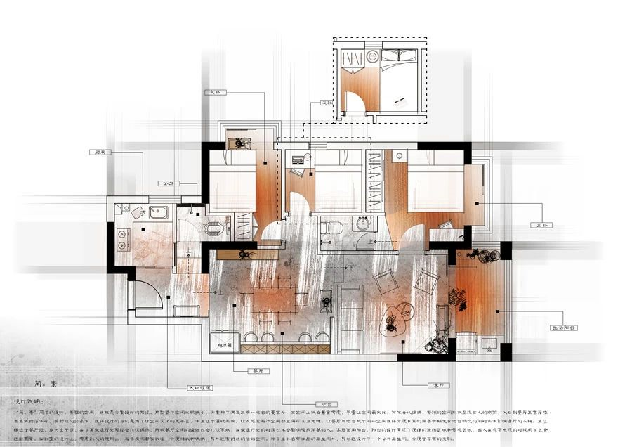 Éè¼ÆËµÃ÷£º 1.ÔÚÑǫ̂´¦»®·Ö³öµÚÈý¼äÎÔÊÒ£¬ÎÔÊÒÀï¿¿½ü¿ÍÌüµÄÄÇÒ»ÃæÇ½×ö³ÉÉÏÃæ²£Á§ÏÂÃæÇ½µÄÐÎʽ£¬¿ÍÌü¿ÉÒÔÒԴ˽è¹â¡£ 2.Ï´ÊÖ¼ä¸Éʪ·ÖÀ룬·½±ã¶àÈËͬʱʹÓã¬ÔÚÎÀÉú¼äÏ´ÊǪ̈Óë¿ÍÌüÖ®¼äÓÃÃÅÁ±¸ô¿ª¡£
