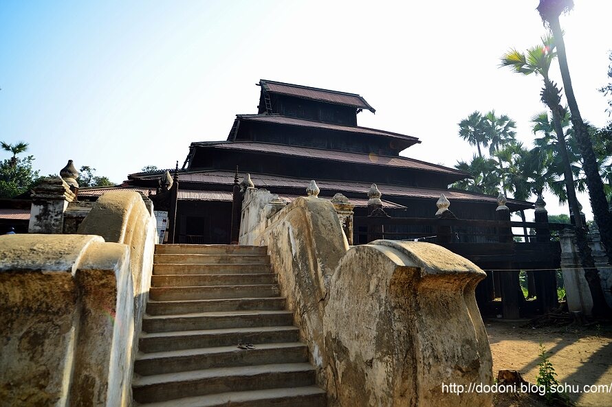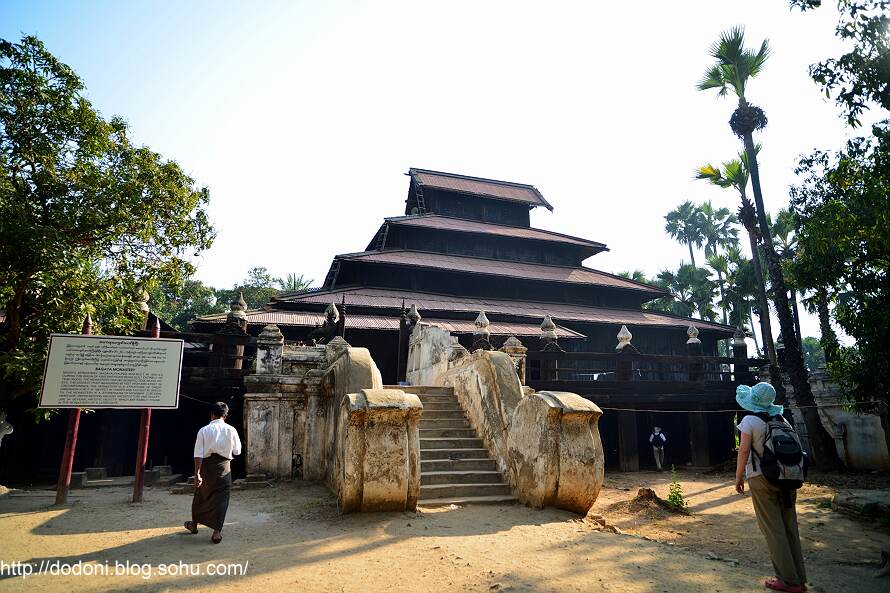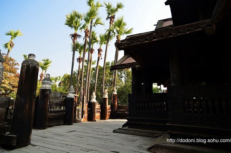 插播:缅甸土豪嫁女 全身翡翠价值5亿 35. 36. 37. 38. 39.一路黄土,来到了古城的另一头 40. 41.因瓦古城里最值得去的景点:宝迦雅(Bagaya Kyaung)僧院,这是一座由267根柚木柱子支撑的寺庙,每一扇门窗、每一根木柱上都有精美的雕刻,人物、花鸟等素材被刻画的栩栩如生,整座寺庙堪称是一件精美的木雕艺术品,从建寺至今这座寺庙从未经过翻新,经过风吹雨打,寺庙的柚木都显得有些发黑发亮。这里曾是缅甸王室接受教育的地方。 42. 43.