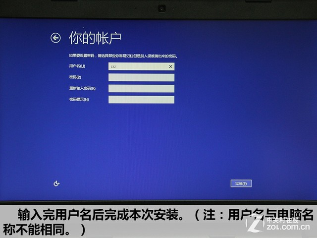 Windows安装过程 输入完用户名后完成本次安装。注:用户名和电脑名不能相同。