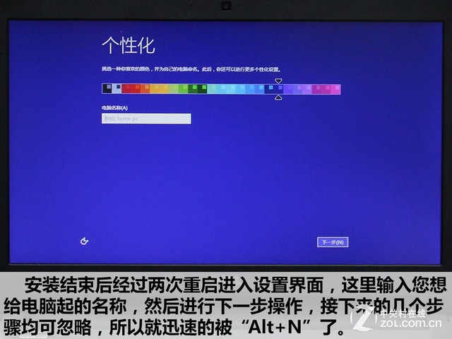 Windows安装过程 安装结束后经过两次重启进入设置界面,这里输入您想给电脑其的名称,然后进行下一步操作,接下来的几个步骤均可忽略,所以就迅速的被“Alt+N”快速过掉了。