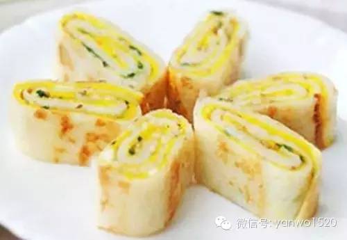 【食材】面粉半碗、鸡蛋2个、淀粉、白芝麻、油、盐4克。 【做法】 ①面粉、水、淀粉、盐、适量油混合,搅拌均匀; ②平底锅倒少许油,然倒入面糊,用勺子摊成面皮,将鸡蛋液覆盖在面皮上,借助勺子将蛋液铺均匀; ③撒葱花、芝麻和肉松,待蛋液即将凝固的时候将饼卷起,卷起后小火再煎一下,待蛋卷上色成金黄即可切块装盘。 插播:鸡蛋卷饼