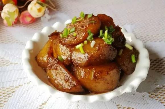 原料:白萝卜1根约500克,姜1块,南乳2块,生抽1汤匙,糖1茶匙,油些许。 做法: 1、白萝卜去头去尾,连皮切滚刀块,生姜清洗干净连皮拍碎。 2、热锅下油,油热下姜爆至闻到姜的香味。 3、加入萝卜翻炒片刻。 4、倒入半碗清水继续翻炒,直炒至水干,继续加入半碗清水,如是反复直炒至萝卜上色通透。 5、然后加入八分水,南乳、酱油、糖,盖上锅盖焖至萝卜完全通透,开盖继续翻炒至收汁即可。 22.红烧肥肠