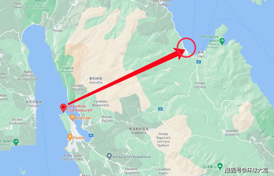 考察队绘制的Katavothres地图 终于在第14天,即1963年3月12日,考察人员在距凯法利尼亚岛直线距离30公里的海岛另一侧,发现了他们投掷的荧光素,直到第16天,这些荧光素检测值达到最高,这一调查结果有力地证明了这里确实是落水洞吸入的海水流出的地方,而这个地方名为梅利萨尼洞窟。