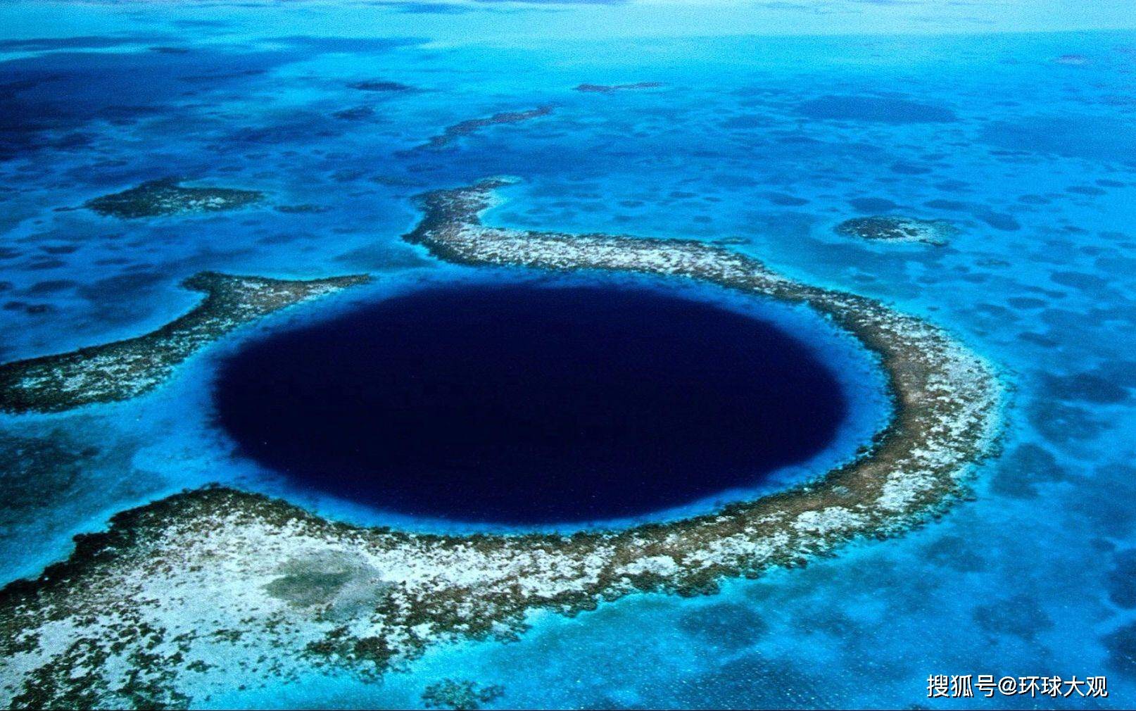 伯利兹蓝洞 据称,美国地理学会曾派出一支考察队进行考察,尝试研究海水流失之谜。考察队将一些不易褪色的深色染料倒入海水,第二年,他们又将许多不溶于水的玫瑰色塑料小颗粒倒入,用于标记海水的流向,以此观察海水流失路径。然而不管是不褪色的染料,还是坚固的小颗粒,在进入到无底洞之后,无一例外地消失得无影无踪,最终考察队只能无功而返。