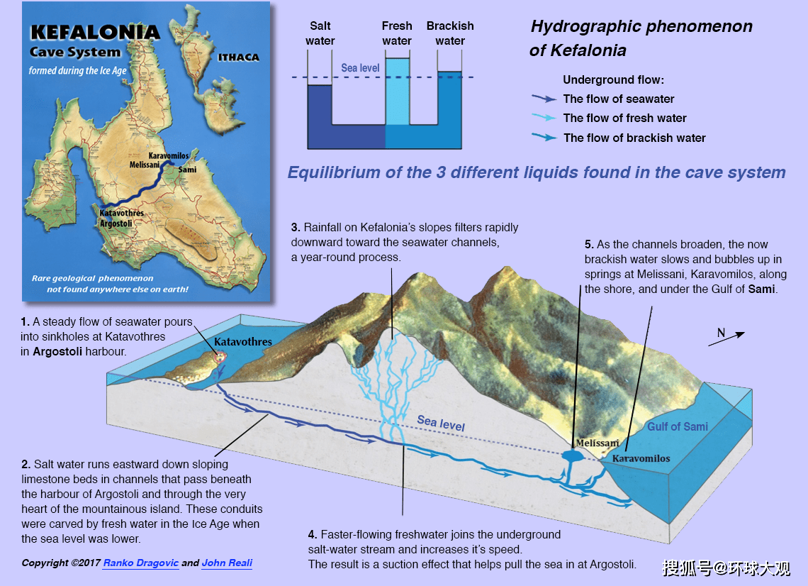 Katavothres 与梅利萨尼洞窟示意图 其实,这个现象简单地说就是初中物流学过的连通器原理,只不过我们将落水洞吸入海水这个现象夸大化,最后变成了“每天吞噬3万吨海水的无底洞”,最后还“海水流失不知所踪”。