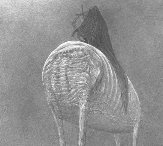 这位骑着马买货者,是一个木乃伊状的干尸,就连它骑着的马也是一具干尸。这幅画作,让我们明白,在那个世界里,生命的呈现都是干瘪的、死气的、毫无生机的,因此也是令人生厌的。