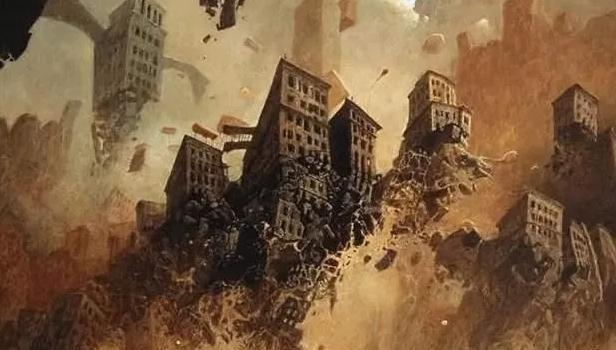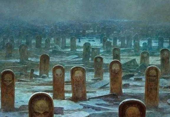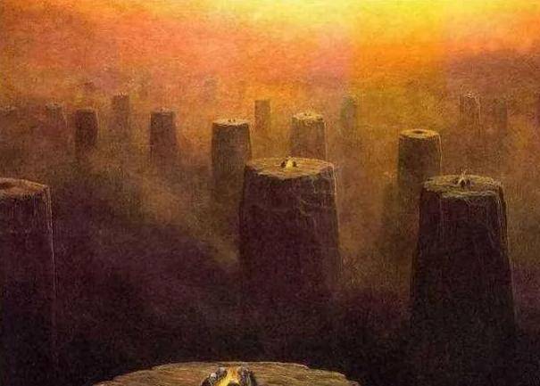 第一幅是死亡世界的整体面貌,从画作中不难看出,那里的世界处处彰显着死亡,树木变作了树墩;城市化作了废墟,到处都是一派死气,空气中灰色阴暗的烟雾可能是魂魄在随处飘荡。这令生人感到压抑和沉闷。