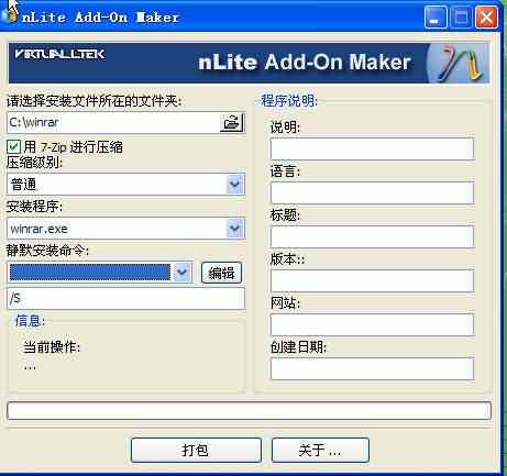 然后点击打包即可完成整合包的制作。 请大家注意,需要注意以下问题 1、你准备用来制作整合包的程序不能放在中文目录下,必须放在英文目录下,不然会出错,我就放在了C:\WINRAR文件夹下。 2、我为什么不直接放在C盘根目录下呢,因为在制作过程中nLite Add-On会检测你的程序所在的文件夹,将其全部打包,也就是,比如我把它放在C盘根目录下,然后点击“打包”nLite Add-On便会把我C盘根目录所有的文件夹全部打包进去了。所以一定要另建一个文件夹。 3、在“静默安装命令”中其实已经提供了许多常用软件的命令,如果你想整合的软件在其列表中则直接选择即可,如果不在就需和上图一样在其下栏自行添加参数,比如WINRAR的是/S 4、右边的“程序说明”可以添加你的一些个性信息