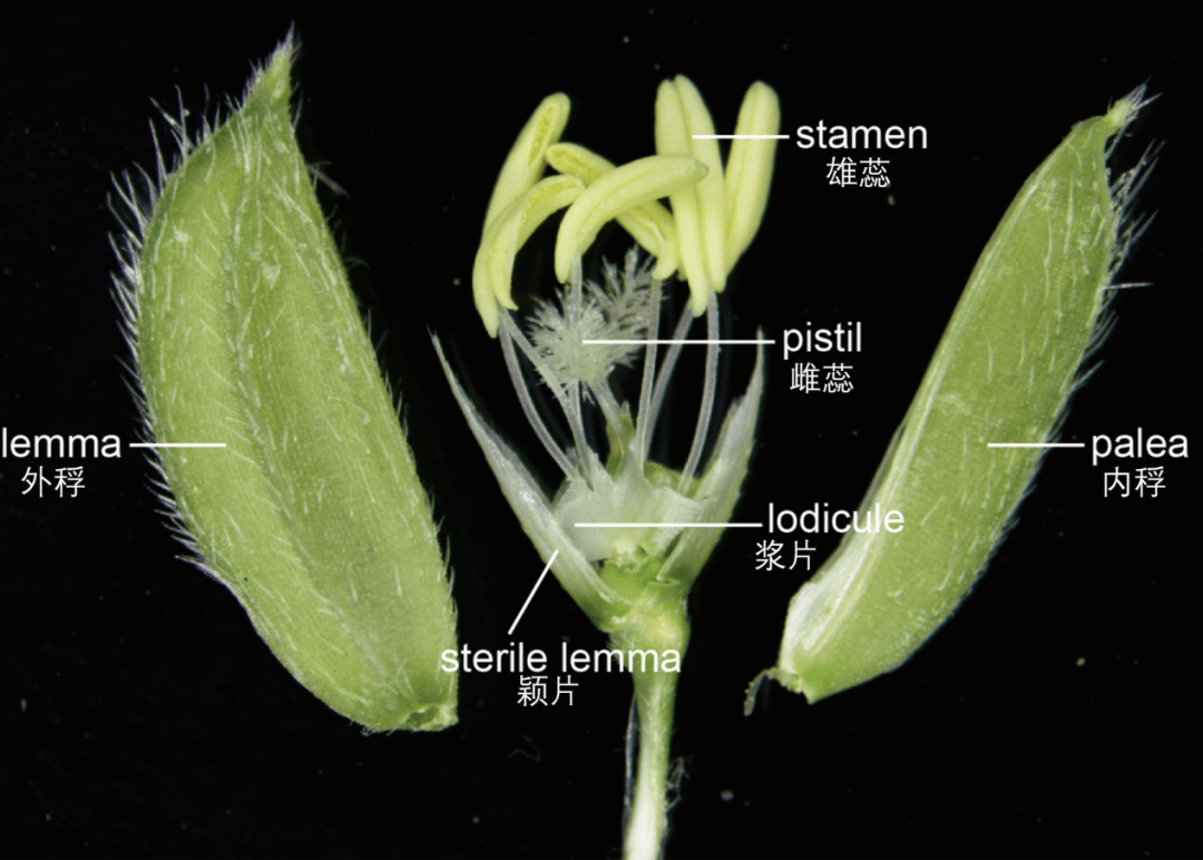 稻花结构(图片来源:参考文献1,作者自行汉化) 在这种情况下,人们要怎么得到杂交的水稻呢? 一种解决思路就是人工去雄:把每朵花的雄蕊去掉只保留雌蕊,然后用其他花的雄蕊和它进行杂交(小tip:为什么是去雄蕊而非去雌蕊呢?因为雄蕊主要负责产生花粉,而雌蕊则要负责接受花粉、并最终发育成果实,如果去掉了雌蕊,就没法结果了)。 但是水稻的花非常微小,而且十分细碎,大家不妨从水稻的稻穗大小来反推一下,就可以看出这去雄的难度。更别提,你还要跟水稻抢时间,一不小心人家就自花授粉了(毕竟对于水稻来说这更便捷)。因此,尽管人工去雄的方法理论上可行,但是实际操作难度非常大。想靠这种方法大规模得到杂交水稻,几乎是天方夜谭。