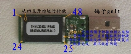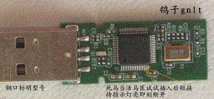 如果U盘假死,就是插入后一点都没有反应的,指示灯也不亮的,电脑没有显示的试试短接图中两个箭头其中一个【反正我是救活了U盘】
