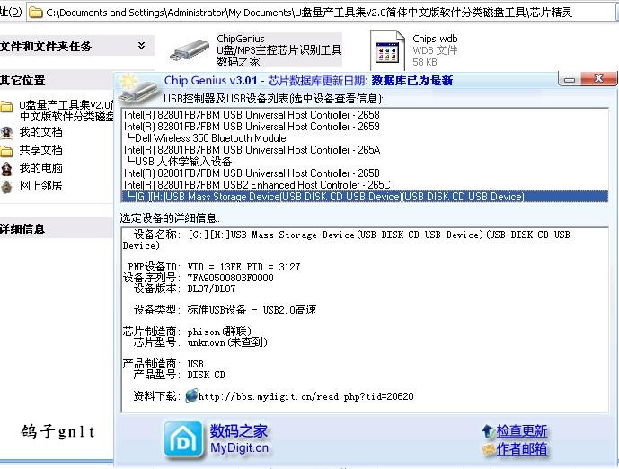 出现了绿色的test finished(pass)-7fa90500808bf0000表示成功了。 量产成功后用芯片精灵显示【软件都在包里,可以用来检测你的U盘型号等】