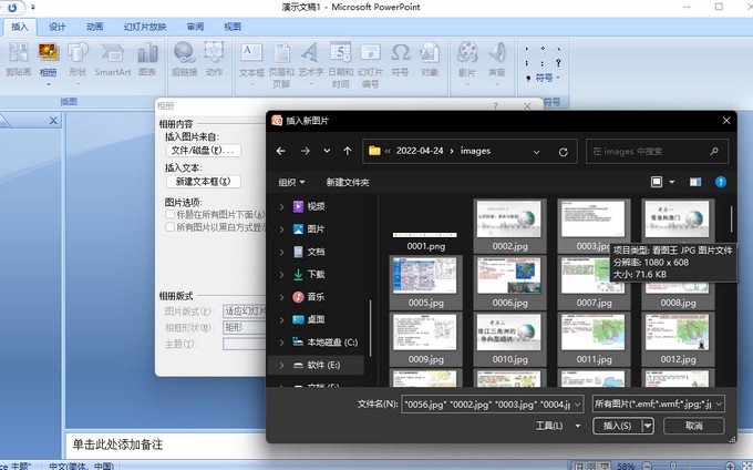 插入图片,选择来自:文件/磁盘,按键盘上的shift+鼠标点击图片,圈选需要的图片,一键导入PPT