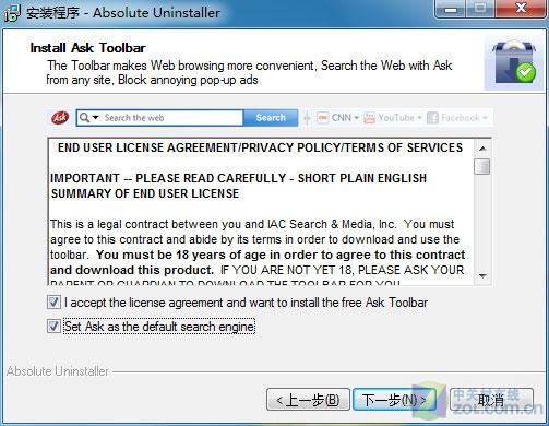 图1 安装步骤很简单,也没有捆绑插件要求用户安装。在出现如图2所示的界面时,是询问用户是否要重新设置默认搜索。如不需要修改,请取消程序默认勾选的“Set Ask as the default serach engine”(如图2)。