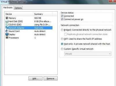 升级到WIN7后,发现VMware无法通过NAT方式上网了,很多网友都遇到这样的问题,而且一直没有找到好的解决办法。其实只要通过HOST-ONLY方式就可以上网。 1、上网方式设成HOST-ONLY(如图1)。