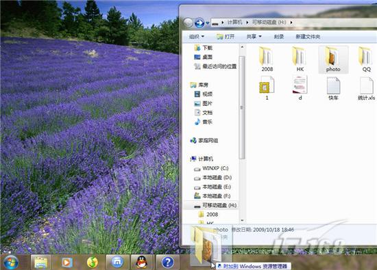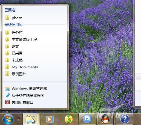 图6 全新的JumpLists功能 大家注意到上图资源管理器的JumpLists菜单中的“已固定”中,有一项叫做“photo”的文件夹,那么是如何固定到这里的呢?很简单,七仔来告诉大家:将要目标文件夹直接拖动到任务栏区域就可以了,你会看到任务栏出现“附加到Windows资源管理器”的提示。是不是很简单呢?这样我们就可以随时快速访问该文件夹了。事实上,要向任务栏添加其他快速启动项目也是同样的操作即可。