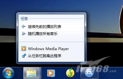 图5 在WMP 11任务按钮上点击鼠标右键的效果 对于Windows 7的“JumpLists”新功能,相比大家都有所耳闻,它可以为每个程序的提供快捷打开,就像是“我最近的文档”的功能,我们只要右键点击任务栏中的图标即可使用这个功能了。