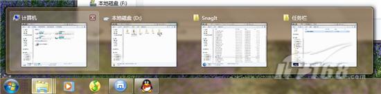 图1 Windows 7美轮美奂的任务栏 就让我们按照从左到右的顺序来看看任务栏的每一部分的功能吧!Windows 7默认会分组相似活动任务按钮,如我们已经打开了多个资源管理器窗口,那么在任务栏中只会显示一个活动任务按钮。或许你会说这是Windows XP早就具备的功能,但是与XP系统不同的是,将鼠标移动到任务栏上的活动任务按钮上稍微停留,你就可以方便预览各个窗口内容,并进行窗口切换,多么酷炫而又实用的效果!