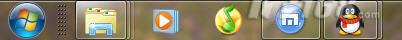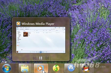 图2 任务栏预览效果 在Windows 7中,XP系统下的快速启动按钮组已经不再单独存在,而是与活动任务按钮合二为一。那么如何分辨同一区域内快速启动按钮和活动任务按钮呢?非常简单,正在运行的活动任务窗口的图标是凸起的样子(如图3中资源管理器、QQ、傲游的图标),而普通的快速启动按钮则没有这样的凸起效果(如图3中WMP11、QQ音乐的图标);而如果像上面的资源管理器那样同时打开多个窗口,那么活动任务按钮也会有所不同:按钮右侧会出现层叠的边框进行标识(如图3中的资源管理器与QQ的图标)。
