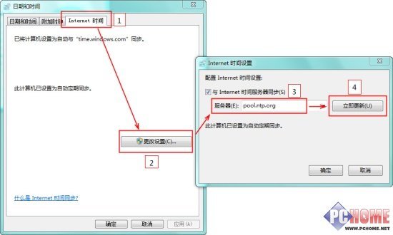 接着,切换到“Internet 时间”标签,点击“更改设置”,在弹出窗口服务器一栏里,删除默认的 time.windows.com,再输入一个新的服务器地址:pool.ntp.org,完成后点击“立即更新”。