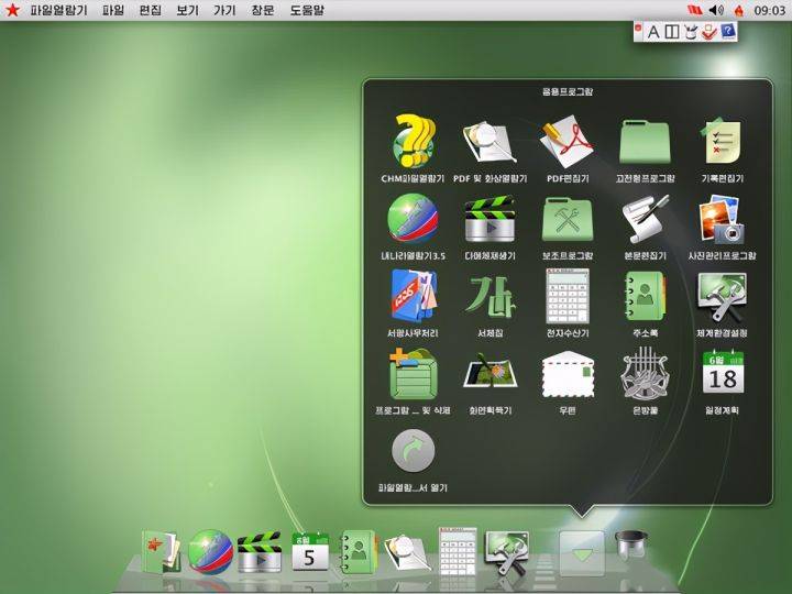 现在再来看看本地优化,在Red Star OS操作系统中几乎看不到除了朝鲜语外的其他文字,本地桌面壁纸库都是朝鲜地区相关风景图。 除此之外,红星OS还会跟踪监控着用户的任意行为,为的就是能够监控电影、音乐等媒体内容文件,从而阻止国外电影、音乐和文章等流入本国。