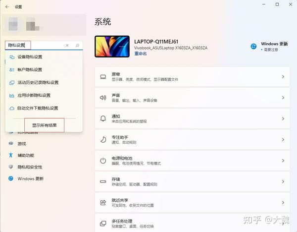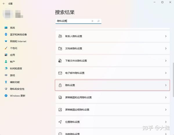 第五步:关闭广告 Win11最烦人的东西,没有之一 打开[设置],左上角搜索框输入[隐私设置]-[显示所有结果],然后下拉选择[隐私设置]