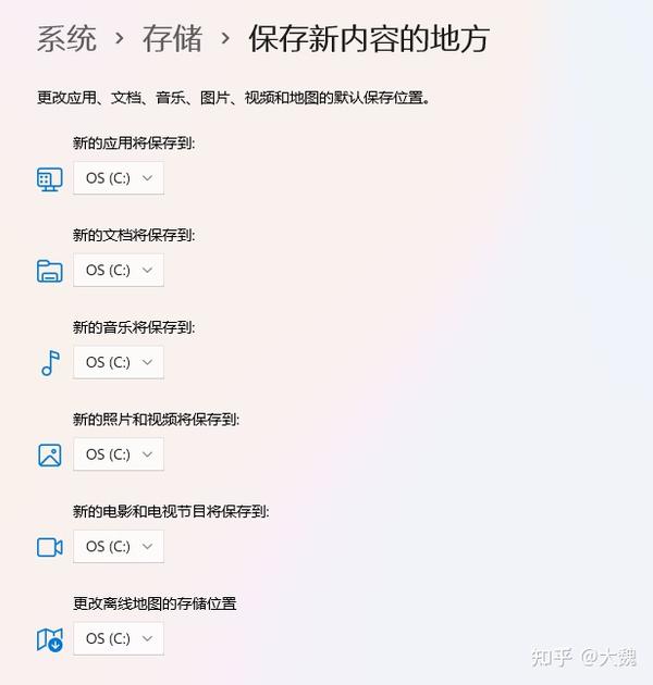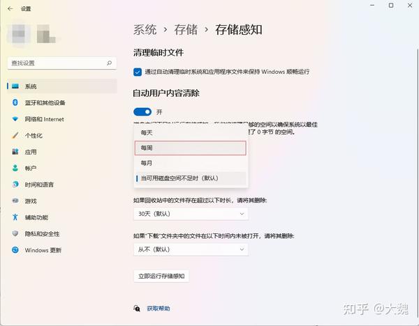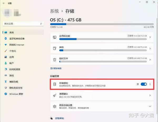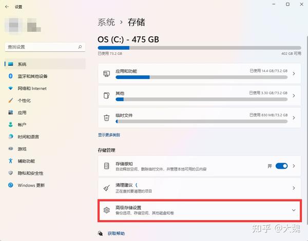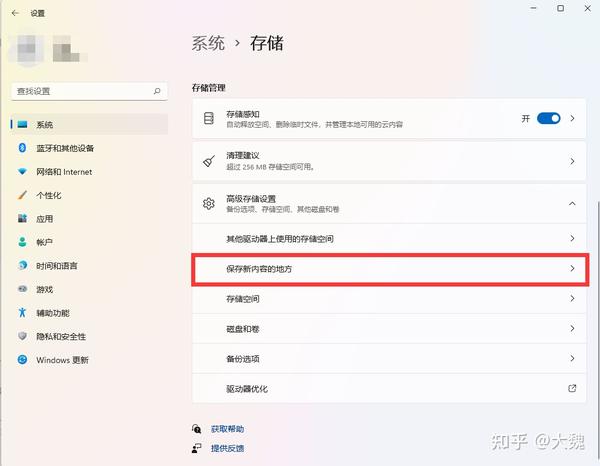 第六步:打开储存感知与修改文件默认储存位置 储存感知可以定期清理系统垃圾,节省磁盘空间 Win11默认文件都是默认储存在C盘,更改后可自定义文件储存位置 打开[系统]-[储存],开启储存感知