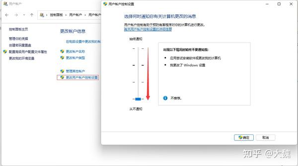 打开[控制面板]-[用户账户]-[更改用户账户控制设],然后将左侧滑块下拉为[从不通知],至于提示的不推荐,直接无视