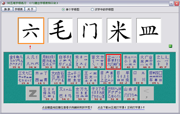 此款软件是86五笔字根练习软件的姊妹篇,是为学习98五笔的朋友设计的,学五笔难在记字根,一般人学习五笔都是通过背五笔字根口诀来记五笔字根表,事实上,五笔是一项技能,通过五笔字根练习软件,你多打多练,可以更好地记下字根所在的键位,此软件对五笔字根表的记忆和五笔的学习都是很有帮助,这款软件可以让你记忆字根事半功倍。 软件自带一个98五笔字根表图和口诀,你可以打印。 软件的字根练习有两种方式,一种是我们常见的看见五笔字根图进行练习。另一种就是在汉字上标明字根位置进行,这种练习方式更加直观。 软件带几款漂亮的界面,你可以更换软件皮肤。此软件免费
