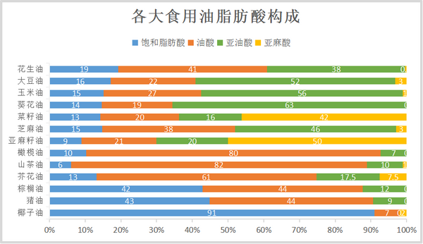 图来源网络侵删 三、油脂的提取工艺 侵出法:利用化学(有机溶剂6号)充分接触,将油脂萃取出来。 优点:出油率高、可以高达98%出油率,生产成本低、效益高。 缺点:侵出油脂再经过精炼(脱酸、脱蜡、脱臭、脱胶、脱色、脱水)后,香味缺失、营养成分下降,并且会有少量的溶剂残留,植物油的精炼过程破坏了健康的多不饱和脂肪酸和配套的抗氧化剂,变成了不健康的畸形油脂分子。大豆油、菜籽油出油率低,基本都是采用侵出法。 压榨法:通过物理(机械)压力挤压植物种子将油脂挤压出来。 优点:压榨的温度较低,不使用溶剂,可以保留油脂的原香味、营养、色泽。 缺点:出油率低、生产成本相对侵出法较高,工艺不规范的也会氧化产生有害物质,芝麻油、核桃油、花生油出油率高采用压榨法。(花生油压榨工艺不成熟有可能出现黄曲霉素) 四、油脂选购指南 1、了解各大油脂 - 不同脂肪酸构成: 从下图可以看到绝大部分油脂的脂肪酸构成,饱和脂肪酸含量最大的棕榈油、猪油、椰子油,不太推荐日常炒菜烹饪,饱和脂肪酸无处不在,摄入已经超标很多了。亚麻酸(不耐热)含量大的菜籽油、芝麻油也不适合。