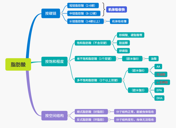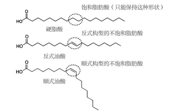 上图自己制作 1)中短链脂肪酸被小肠细胞吸收经肝门静脉进入血液循环,而长链脂肪酸(饱和脂肪酸)需要胆汁乳化和脂肪酶的水解,形成乳糜微粒由淋巴系统进入血液循环满足机体需要,最终被肝脏吸收。 2)顺式脂肪酸是结构保持同一形态的好脂肪酸,而臭名昭著的(反式脂肪酸)是发生氢化、分解的坏脂肪酸,部分脂肪酸分子变形,导致人体无法吸收并堆积在血管壁,经研究表明:反式脂肪酸可以使血清低密度脂蛋白胆固醇(LDL-C)升高,使高密度脂蛋白胆固醇(HDL-C)降低,增加动脉硬化及心血管等疾病的风险,它的其他名称:过氧脂质、脂加氧酶、氧化脂肪、脂质过氧化物,指的是工业氢化的植物油。