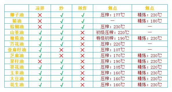 图为自己制作,数据来源:李再贵教授视频、苍茫谣天猫旗舰店 2、油脂适合的烹饪方式 油脂的烟点一般精炼加工过的,油脂耐热性会被提高,物理压榨的一般低一些,无论哪种油脂,在加热到210℃时冒青烟、油脂开始分解,持续加热到230℃时,就会产生反式脂肪酸。 所以建议日常炒菜时,锅热后倒入油脂,不要等冒烟才再放入食材,冒油烟后会产生PM2.5及苯丙胺等致癌化合物。