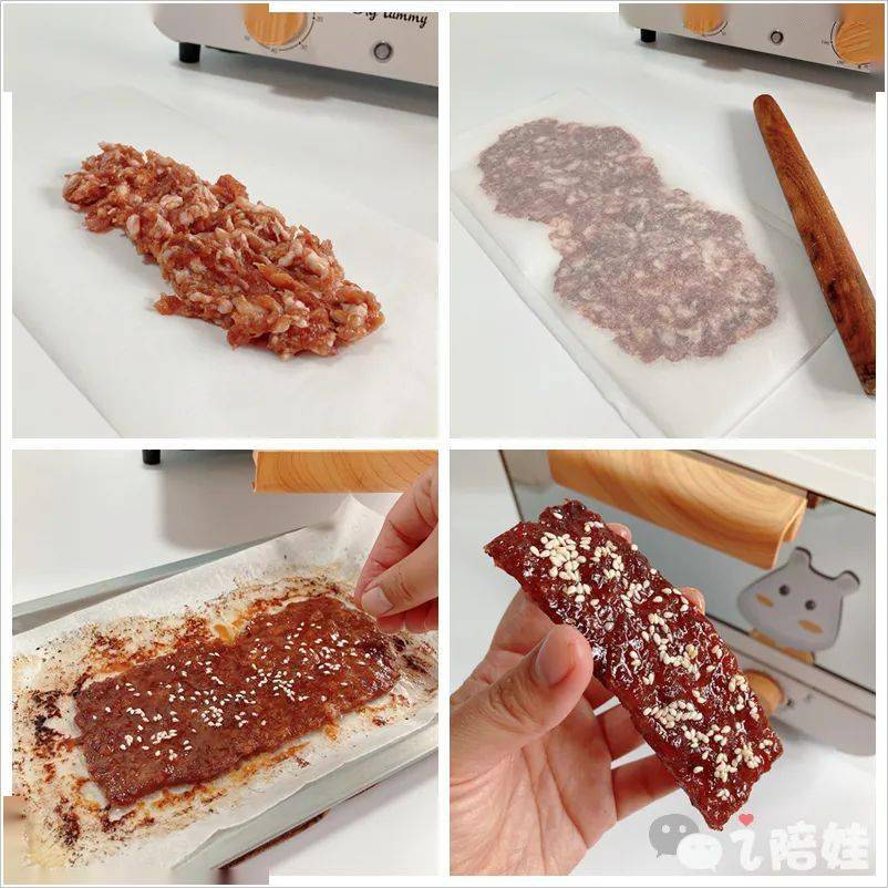 后来还看到做肉铺的,把调好味的肉馅放在两张油纸中间,用擀面杖擀成薄薄一片,放在烤箱里烤,中途再刷下蜂蜜水、撒点芝麻,味道真不比外面买的差,吃着还放心。