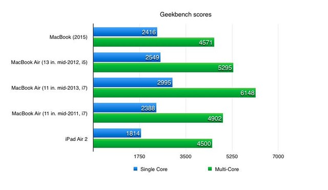 Geekbench跑分数据(图片来源:onemorething) 再看看Geekbench的实测数据,你在一瞬间会认为新Macbook是一款鸡肋产品,它很大程度上会被打入冷宫。紧接着你会抛出苹果为什么会推出这样一款产品的疑问,而在本人看来这是苹果对于未来的布局,详细内容参见《新Macbook背后 苹果布局2合1的5大论据》,这里就不再赘述了。 在笔者来看,新Macbook被如此诟病很大程度上是由于用户重度娱乐应用的惯性思维,近几年笔记本电脑的性能越来越强,大家已经习惯于高价买来的本本能够有出色的游戏体验,而且你可能刚刚告别了一款游戏本或者身处在这种娱乐环境中,突然去体验新Macbook显然会将应用记忆带到这款产品上。
