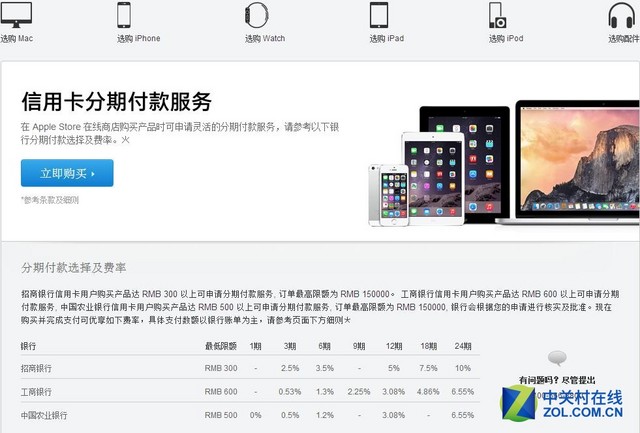 苹果在线商店信用卡分期付款服务页面 为什么都是有息的? 可能你虽然不差钱,但就是不想一下花这么多钱去选购,那么你就会选择分期付款,如今苹果在线商店仅支持招商银行、工商银行和中国农业银行的信用卡分期付款服务,当你选择了某款产品点击页面下方的“更多信息”就会进入如上图的页面。